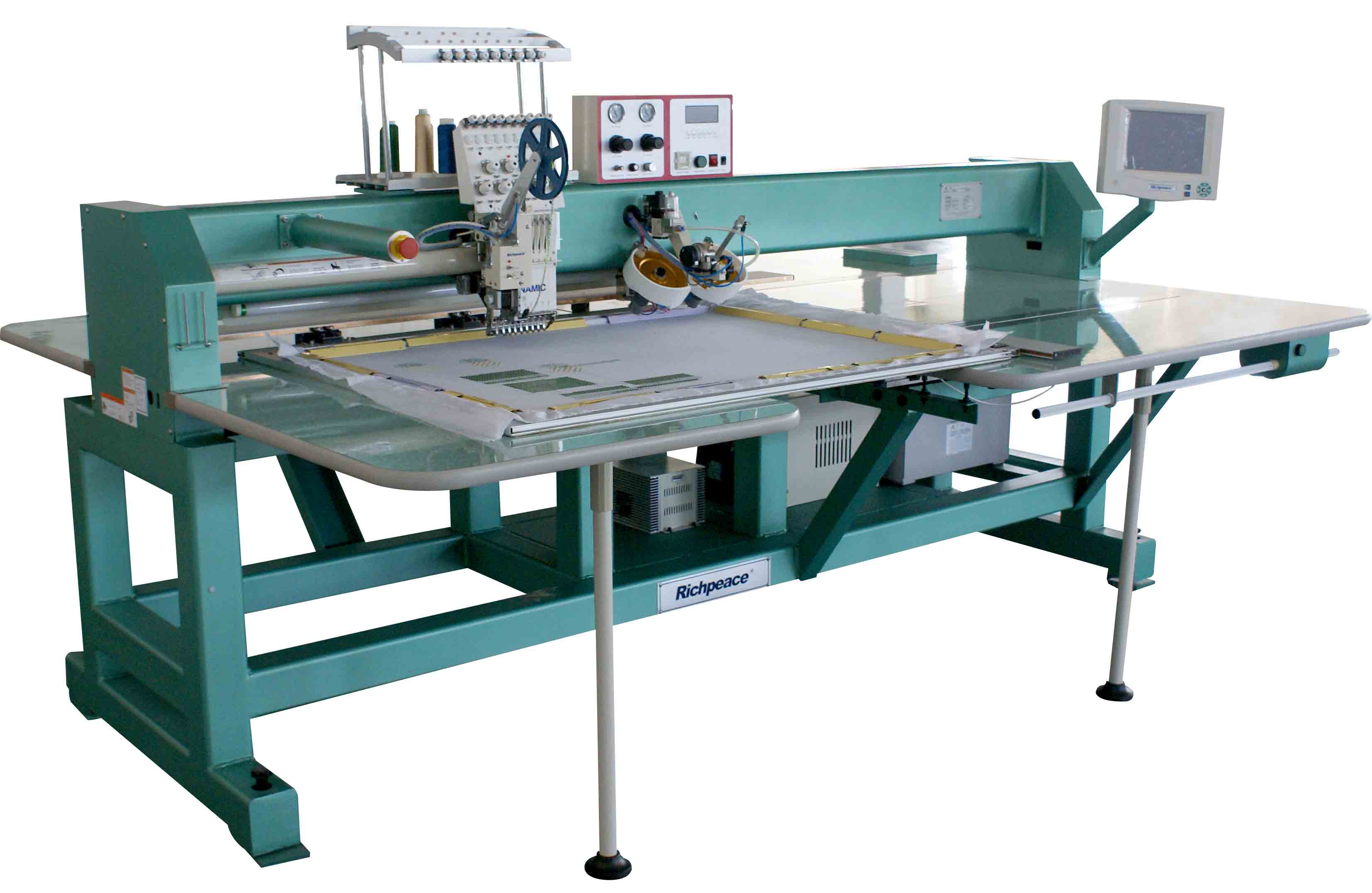 | 主要特點________________________________________• 花樣旋轉(zhuǎn)以及按比率放大和縮小:按照1%的單位增量放大縮小花樣范圍從50%到200%.按照1°的單位增量旋轉(zhuǎn)花樣范圍從0-89° • 獨立電機勾線: 更可靠,噪音小 • 可調(diào)壓腳:可以根據(jù)不同的布料厚度進行調(diào)整. • 標準繡做面積大:繡做面積為520X450mm • 電腦控制:5英寸液晶操作屏,帶USB和網(wǎng)絡(luò)接口 主要功能________________________________________• 多功能繡花機:使用范圍: T恤衫,運動衫,成衣,成帽繡以及普通的平繡 • 斷電保護功能:當電源突然斷電時,機器可以自動搜索到斷電前的暫停狀態(tài)繼續(xù)進行繡作 • 自動底線和面線斷線檢測功能:當?shù)拙或面線斷線或沒線的時候,機器會檢測到,并且自動停機 • 速度自動調(diào)節(jié):根據(jù)針步的大小自動增減轉(zhuǎn)速以調(diào)節(jié)到最合理的轉(zhuǎn)速 • 進框/倒框:進框/倒框健可以按照針跡,換色,或指定的針數(shù)進行移框 |